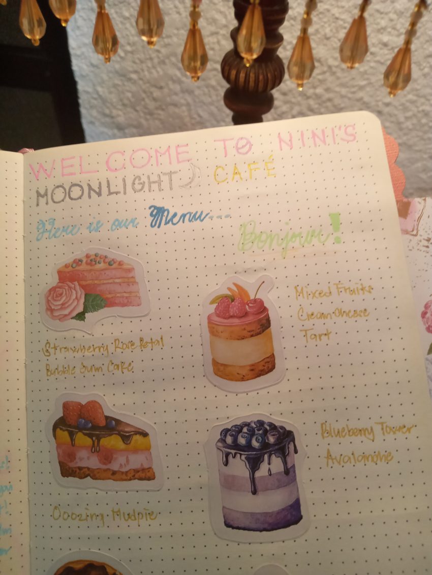 So, once again I bought these cute dessert stationery stickers from Shopee for my bullet journal a few months ago. I love sweets and when there was no pandemic, I love going to coffee shops and buying different sweets especially those that I haven’t tasted before. When these yummy-looking stickers arrived, I instantly opened its cute small box and checked the designs of each one. Again, just like in my previous blog post, I didn’t know when will I use these stickers because I can’t think of a theme on my bullet journal on when to best use them. Staring at these stickers one day along with my other stickers gave me an idea to make my own menu! When I was young, I always wanted to have my own coffee shop because I love the ambiance that it brings where it will always be the perfect place for writers where my imagination can soar. I even came up with a name and shared it with my family, I thought Moonlight Café would be the best. I heard this sort of jazz song in the past referring to a moonlight and I think it’s relaxing and romantic to the ears so why not make it the name of my coffee shop and let this be the music played inside. So, I opened my bullet journal to a clean page and began using my colored gel pens, and wrote: Welcome to Nini’s Moonlight Café. Good thing bullet journals have these dots on the pages so it makes my handwriting look beautiful. 😉