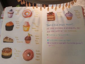 After writing my coffee shop sign I began putting on the dessert stickers one by one beside each other leaving a small space in between just like what I see on coffee shops. I stared at each cute and yummy-looking sticker for a few seconds then unconsciously I started writing down their names. I looked at the colors, tiny details, shapes, and other interesting content and came up with my invention of desserts and pastry names! Here’s an example: Strawberry Rose Petal Bubble Gum Cake. After writing it down, I thought to myself, Would I even eat it? It sounds a bit gross but I kept writing and found myself creating weird and fun names of cakes and pastries that I guess no one has ever heard of before.
