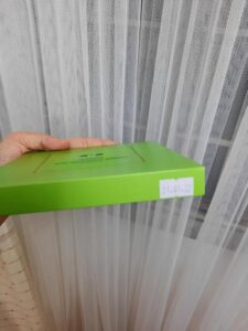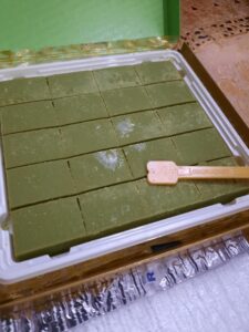 You will see 20 pieces of beautifully placed small rectangular green tea chocolates lightly dusted with matcha powder. It leaves a gentle matcha scent that matches its smooth and cold outer texture. It comes with a tiny plastic knife that you can use to slice it.