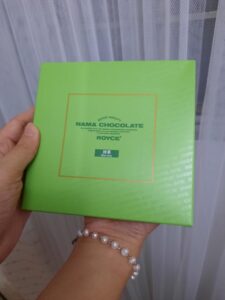 If you’ll check out Royce’s website, they describe their White “Nama Chocolate” with the aroma and bitterness of green tea, made by blending in powdered premium green tea leaves and sprinkling on green tea-flavored chocolate powder. It’s a fine, delicate combination of selected chocolate and fresh cream with a hint of prestige liqueurs. Royce Nama Chocolate is velvety smooth, and melts in your mouth. Its shelf life is one month.
